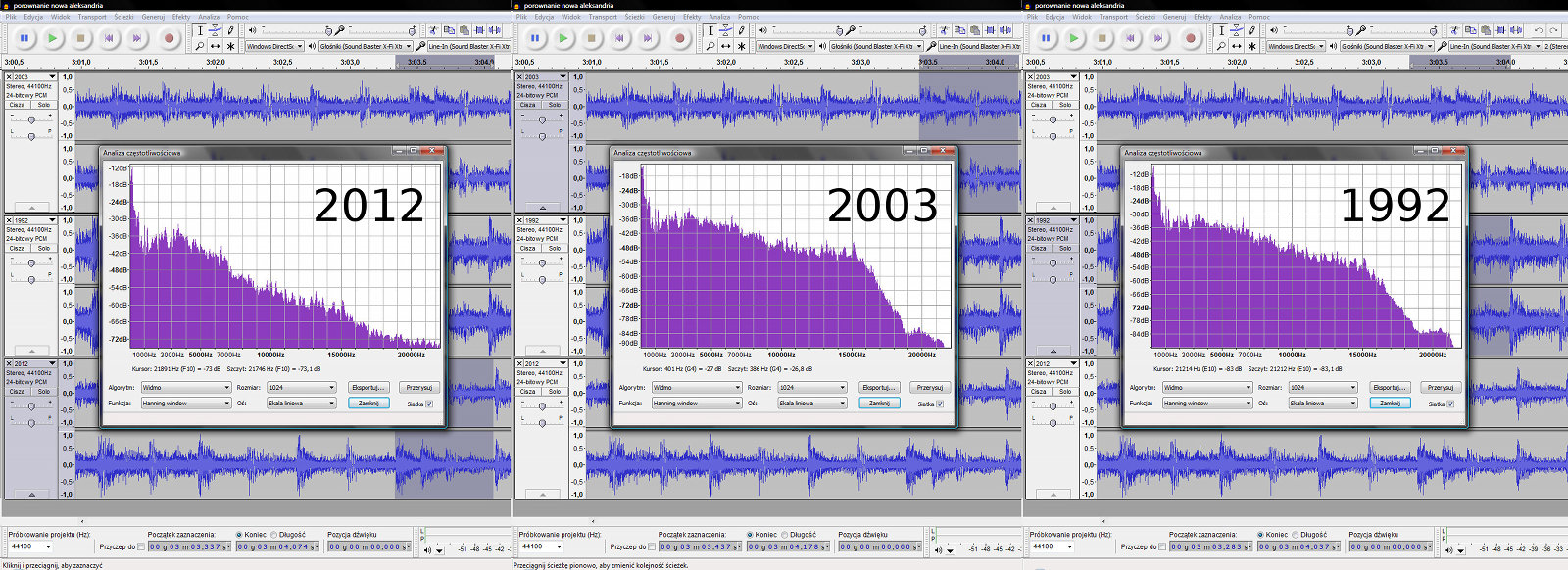 Postawmy sprawę jasno: wydanie z 2012 roku brzmi najlepiej. Nagranie z oryginalnej taśmy-matki zostało zdigitalizowane 24bit (wg informacji na okładce – 32bit?) / 192kHz z użyciem ProTools HD, Studera A820 i Dolby A. Zdaje się, że to właśnie brak tego ostatniego jest gwoździem do trumny poprzednich wydań CD. Ich brzmienie ma mocną, twardą średnicę i górę i nie da się ich słuchać głośno. Są krzykliwe i rozjaśnione. Wydanie 2012 na ich tle gra zrównoważonym i bardziej dynamicznym dźwiękiem co świadczy o tym, że poprzednie wydania poddawano nadmiernej kompresji. Taśmy były odtwarzane z nieco różną prędkością: wystarczy zrzucić wybrany utwór do komputera, żeby przekonać się, że z każdej płyty otrzymamy innej długości plik. Analiza częstotliwościowa pokazuje podbicie góry na starszych wydaniach. Porównując wydania z różnych lat widać nie tylko zamienione kanały ale chyba nawet odwróconą fazę. Analizując kształt fali można by pomyśleć, że widzimy trzy różne utwory – a oglądamy fragment tego samego utworu z różnych wydań płyty. Różnią się naprawdę radykalnie.